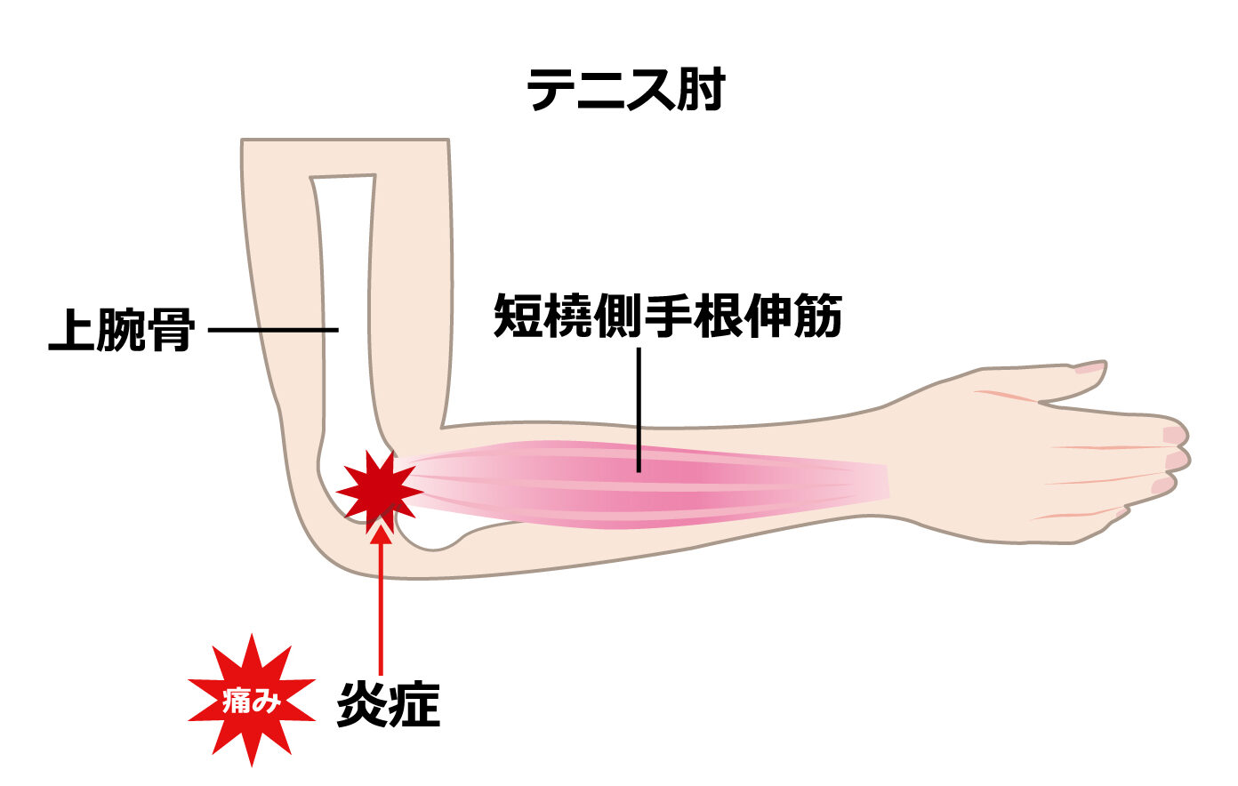 一番の理由は、使い過ぎ(オーバーユース)により発症するため、肘部や前腕部に強く痛みが出ます。